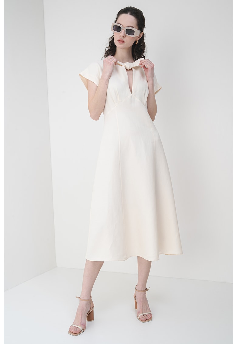 Характеристики Цвят: бледожълт Стил: елегантен Материал: вискоза – лен – лиосел Принт: без принт Кройка: клош Дължина: средна Деколте: шпиц Дължина ръкав: къс ръкав Закопчаване: цип Състав Външна част: 43% вискоза – 32% лен – 25% лиосел Информация за модел Моделът е облечен с …