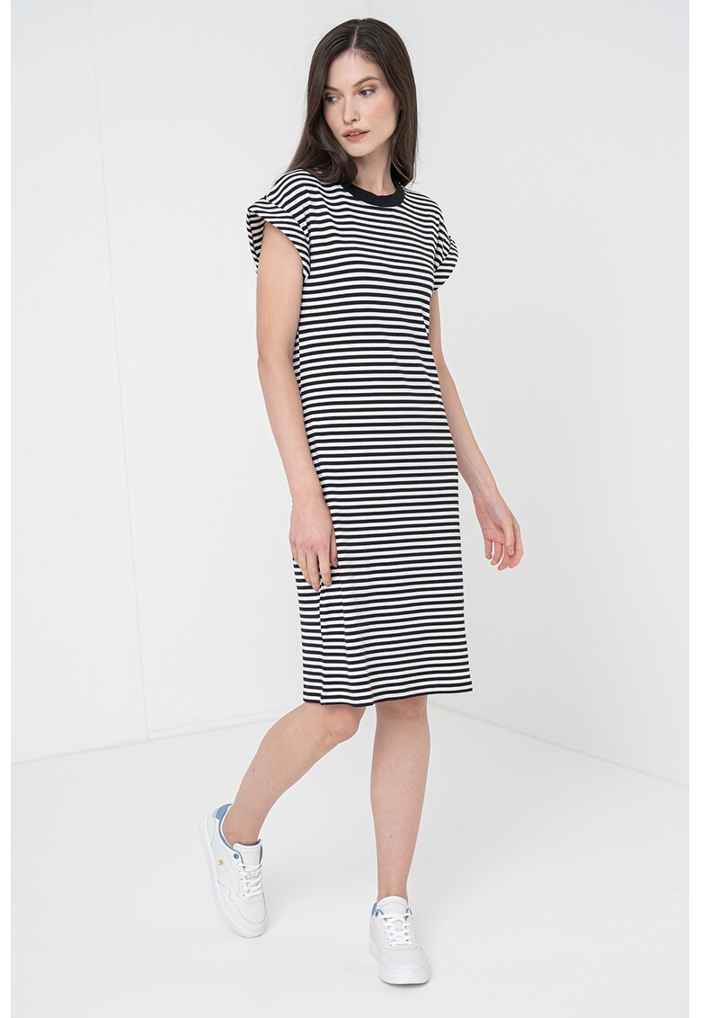 Характеристики Цвят: бял – черен Стил: ежедневен Материал: памук Принт: райе – лого Кройка: права Дължина: средна Деколте: кръгло Дължина ръкав: къс ръкав Закопчаване: без закопчаване Състав Външна част: 100% регенеративен памук Информация за модел Моделът е облечен с …