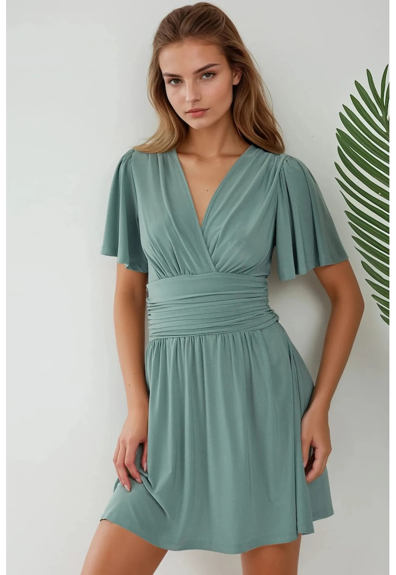 Мини рокля къс ръкав – V-образно деколте – зелен – трико HiCCUP