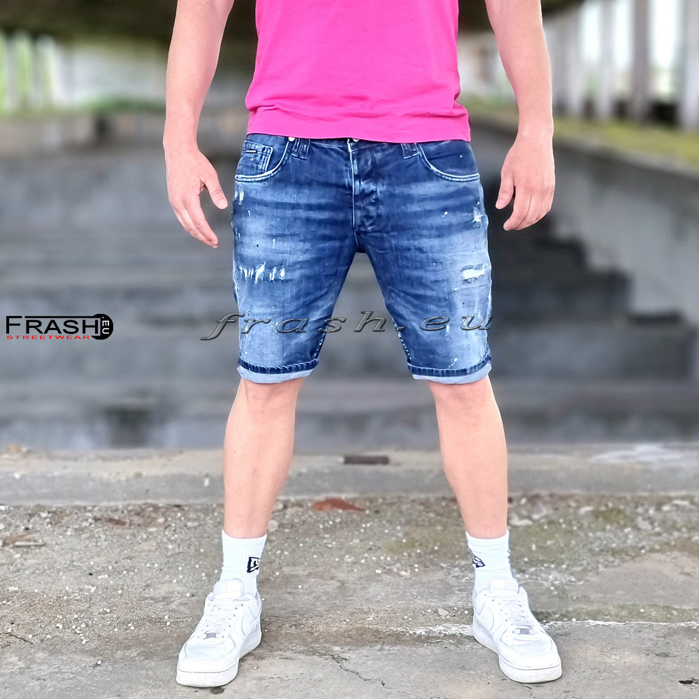 Мъжки къси дънки накъсан ефект, напръскани с боя, син Ft7081