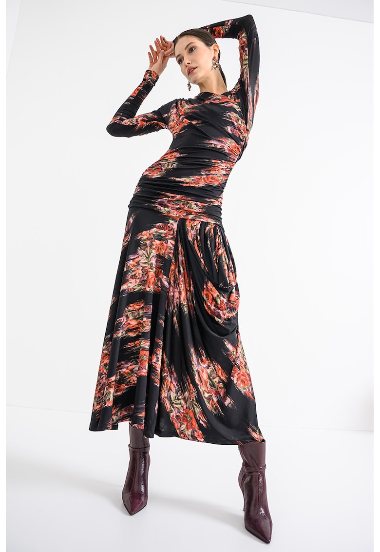 Набрана флорална рокля – Черен/Аленочервен GANNI