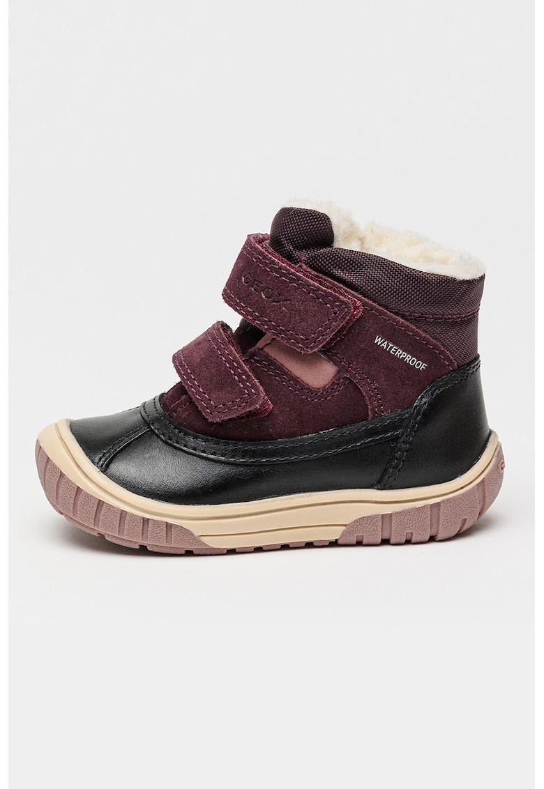 Основни характеристики Тип продукт: боти Цвят: черен – тъмновиолетов Материал: непромокаем – текстил – велур – eстествена кожа Стил: ежедневен Дължина: глезен Закопчаване: велкро Технология: geox respira® – водонепропусклива материя – flexy system Тип на подметката: плоска Детайли: …