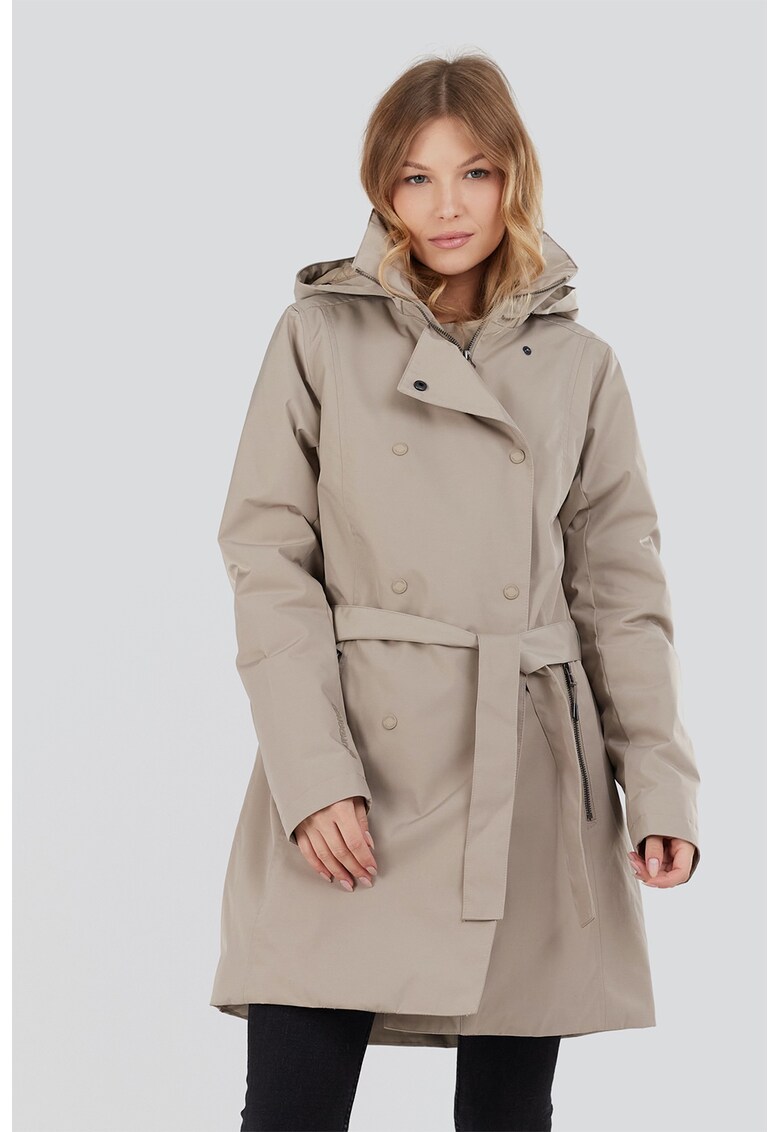 Характеристики Тип продукт: тренч Цвят: бежов Принт: без принт Стил: ежедневен Материал: полиестер Кройка: стандартна Дължина ръкав: дълъг ръкав Джобове: 2 странични с цип Детайли: колан – непромокаемост: 3000mm – проветривост: 3000 g/m2/24h Закопчаване: капси Състав Външна част: …