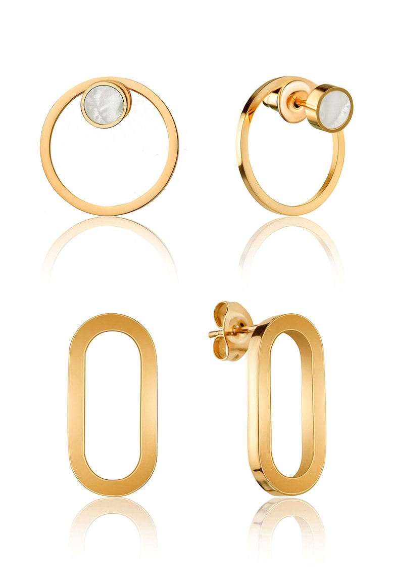 Характеристики Тип продукт: обеци Материал: инокс Цвят: бял – златист Съдържание пакет: 2 чифта обеци Закопчаване: винтова пръчка Бранд линия: emma Опаковка: продуктът се доставя в персонализирана опаковка. Състав Състав: неръждаема стомана Камъни: без камъни Покритие: ip …