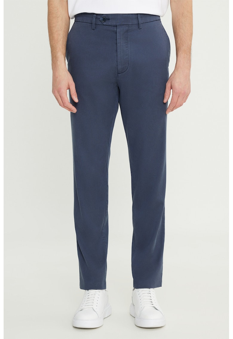 Характеристики Цвят: тъмносин Принт: без принт Материал: памук – лиосел Стил: елегантен Кройка: по тялото Талия: средновисока Джобове: 4 Дължина: дълъг Закопчаване: цип Състав Външна част: 62% лиоцел – 23% памук – 13% полиестер – 2% еластан
