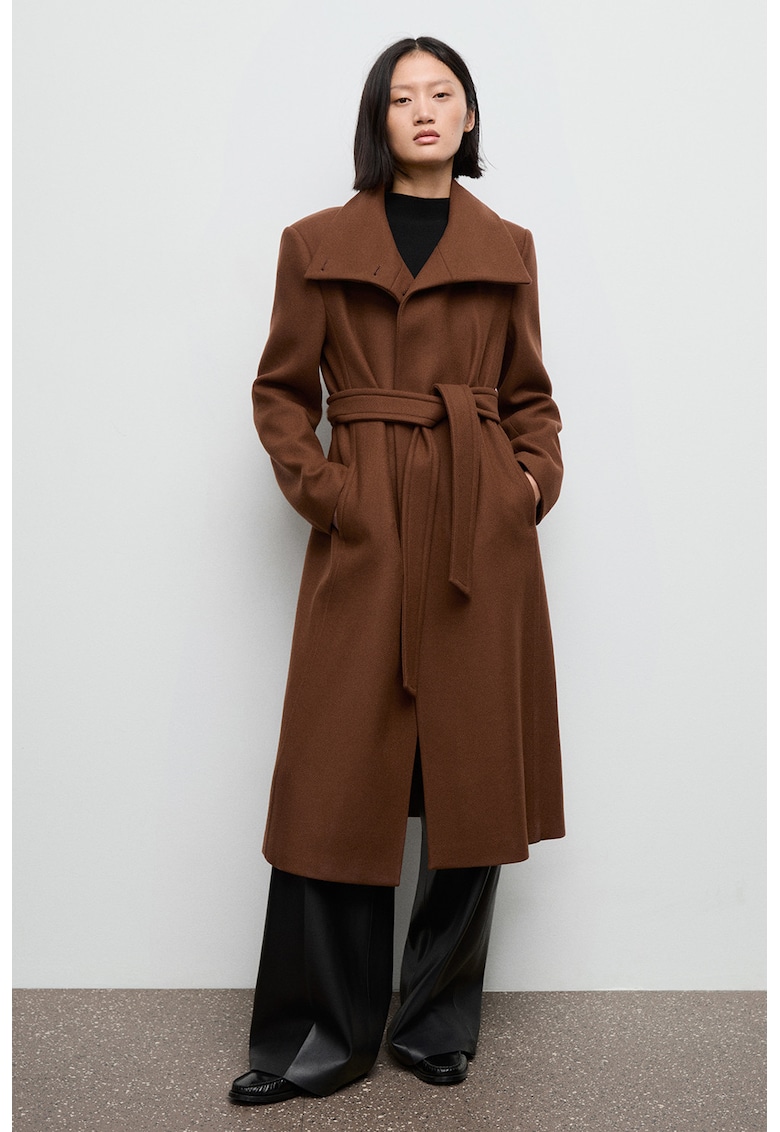 Палто с вълна и връзка – Кафяв Mango