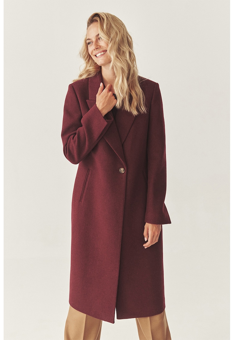 Характеристики Тип продукт: палто Цвят: бордо Принт: без принт Стил: елегантен Материал: полиестер – вълна Кройка: права Дължина ръкав: дълъг ръкав Закопчаване: копчета Състав Външна част: 58% вълна – 42% полиестер