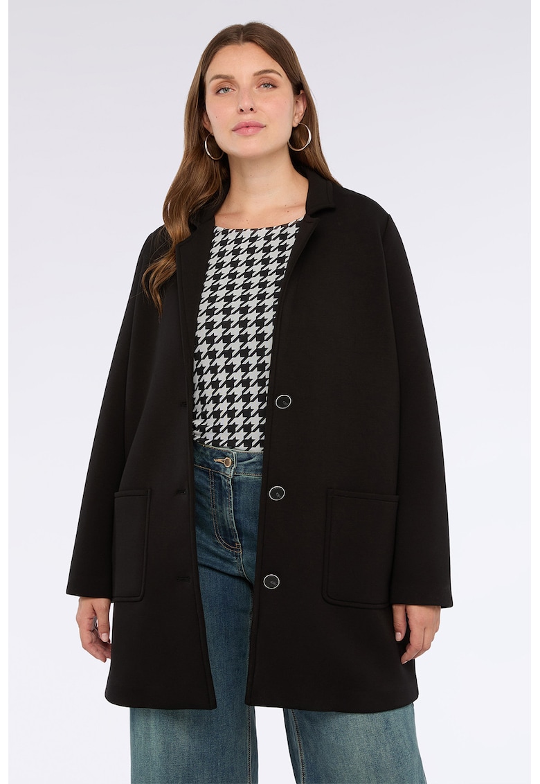 Характеристики Тип продукт: палто Цвят: черен Принт: без принт Стил: ежедневен Материал: вискоза Кройка: свободна – curvy Яка: ревери Дължина ръкав: дълъг ръкав Джобове: 2 пришити Детайли: този продукт е предназначен за дами с пищни форми (плюс размер). Закопчаване: копчета …