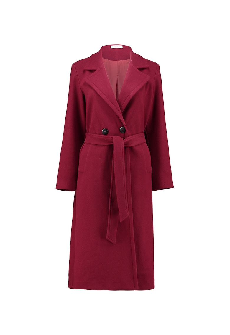 Характеристики Тип продукт: палто Цвят: тъмночервен Принт: без принт Стил: ежедневен Материал: полиестер Кройка: стандартна Яка: класическа Дължина ръкав: дълъг ръкав Закопчаване: копчета – колан Състав Външна част: 100% полиестер