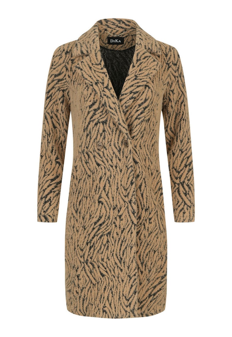 Характеристики Тип продукт: палто Цвят: тъмнобежово Принт: животински принт Стил: елегантен Материал: полиестер – полиамид Кройка: стандартна Яка: ревери с цепка Дължина ръкав: дълъг ръкав Закопчаване: копчета Състав Външна част: 63% полиамид – 37% полиестер