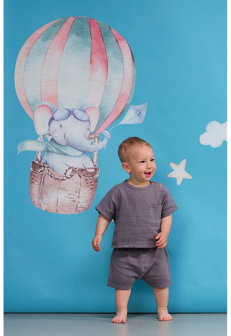 Характеристики Съдържание пакет: тениска и къс панталон Цвят: tъмносив Принт: без принт Кройка: стандартна Материал: органичен памук – устойчиво Дължина ръкав: къс ръкав Дължина панталон: къс Закопчаване: капси Детайли: еластична талия – един джоб на гърдите Състав …