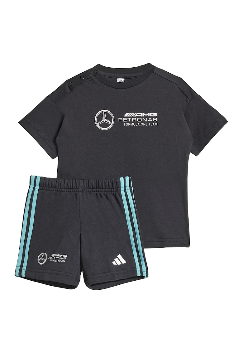 Характеристики Съдържание пакет: тениска и къс панталон Цвят: черен – тюркоаз Принт: лого Кройка: стандартна Материал: памук Дължина ръкав: къс ръкав Дължина панталон: къс Закопчаване: капси Състав Външна част: 100% памук
