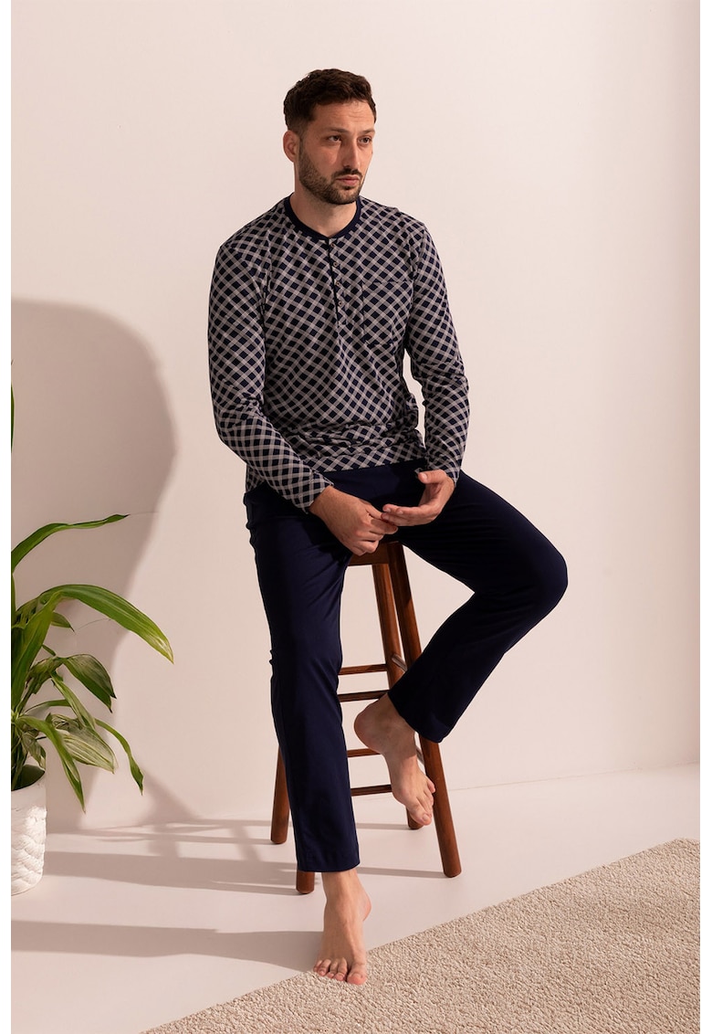 Характеристики Тип продукт: пижама Цвят: тъмносин Принт: графичен Материал: памук Деколте: oблено деколте Дължина ръкав: дълъг ръкав Талия: еластична Дължина панталон: дълъг Състав Външна част: 100% памук