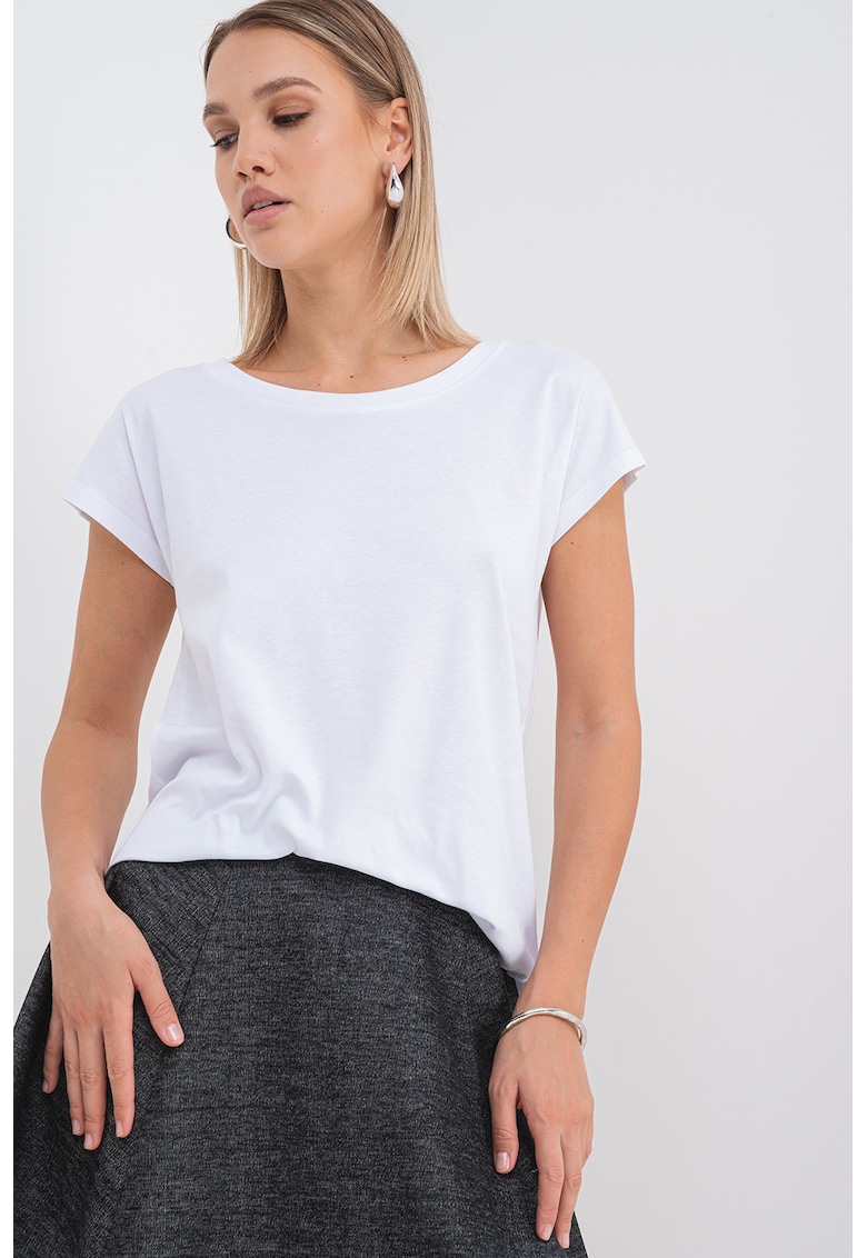 Характеристики Цвят: бял Принт: без принт Материал: памук Кройка: стандартна Модел: овален Дължина ръкав: къс ръкав Състав Външна част: 100% памук Информация за модел Моделът е облечен с размер S. Размер на модела: 180 cm височина – 80 cm Гръдна обиколка – 63 cm Талия – 96 cm Ханш