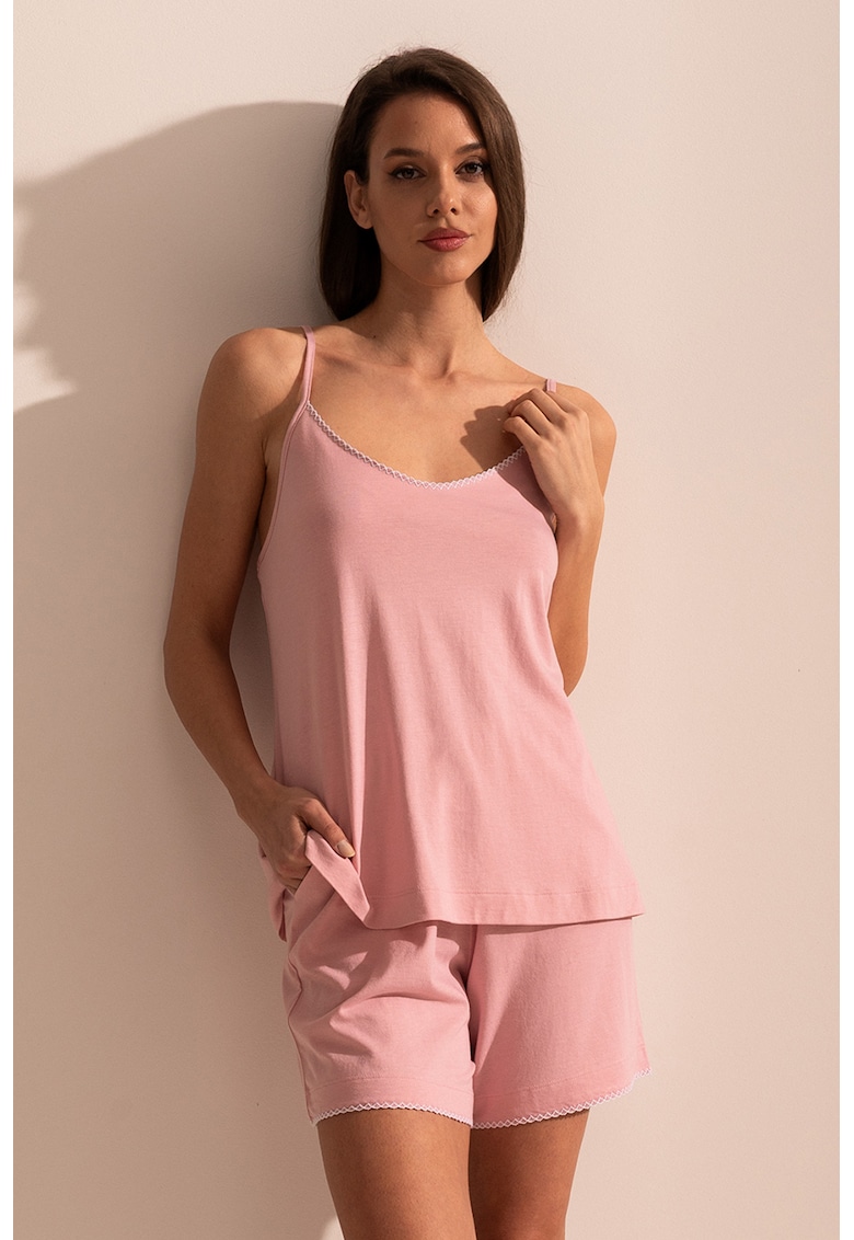Характеристики Тип продукт: пижама Цвят: бледо розово Материал: памук – бамбукови влакна Принт: без принт Деколте: шпиц Кройка: стандартна Презрамки: тънки Дължина ръкав: без ръкав Талия: еластична – средновисока Дължина панталон: къс Закопчаване: без закопчаване Състав …