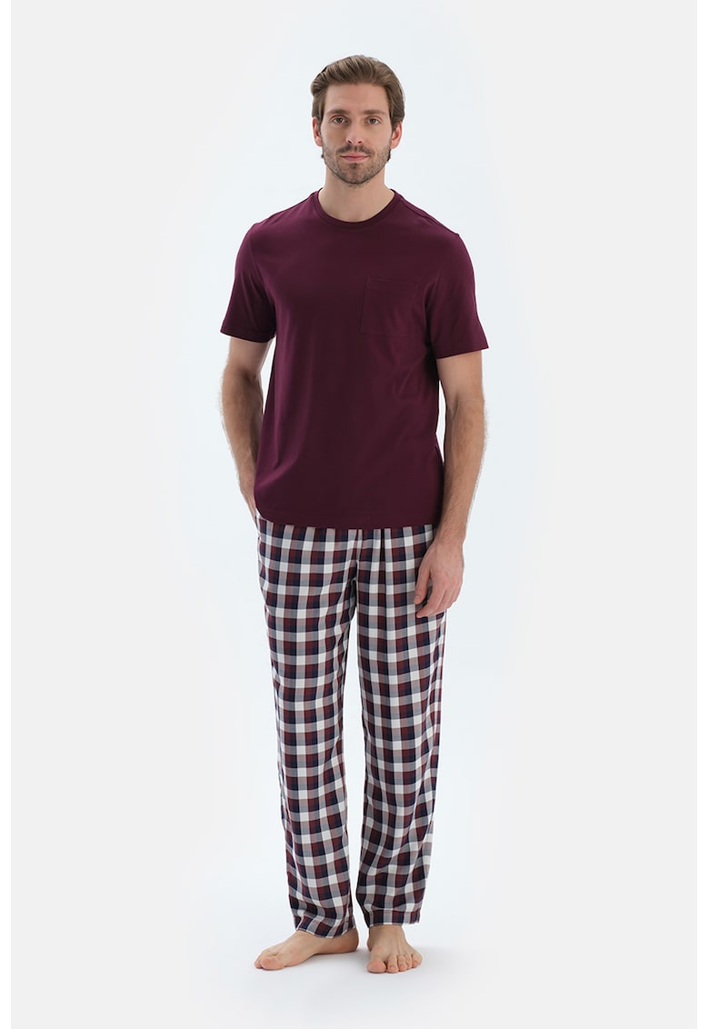 Характеристики Тип продукт: пижама Цвят: бордо – бял Принт: каре Материал: памук – модал Деколте: кръгло Дължина ръкав: къс ръкав Дължина панталон: дълъг Състав Външна част: 50% модал – 50% памук