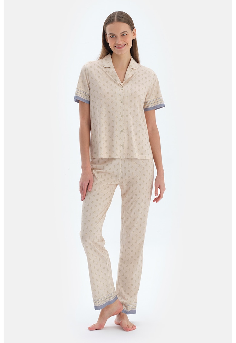 Пижама с памук и модал с къси ръкави – Прашно синьо/Светло бежово DAGI