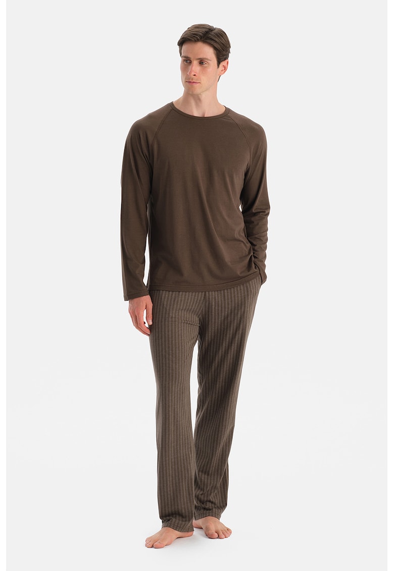 Характеристики Тип продукт: пижама Цвят: сиво-кафяв Принт: райе – без принт Материал: памук – модал Деколте: овално Дължина ръкав: дълъг ръкав Талия: средновисока Дължина панталон: дълъг Състав Външна част: 50% модал – 50% памук