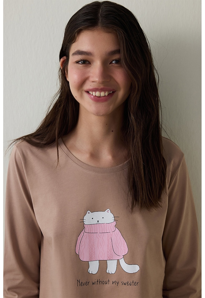 Характеристики Тип продукт: пижама Цвят: camel Материал: памук Принт: графичен Деколте: кръгло Кройка: стандартна Дължина ръкав: дълъг ръкав Талия: еластична Дължина панталон: дълъг Закопчаване: без закопчаване Състав Външна част: 100% памук