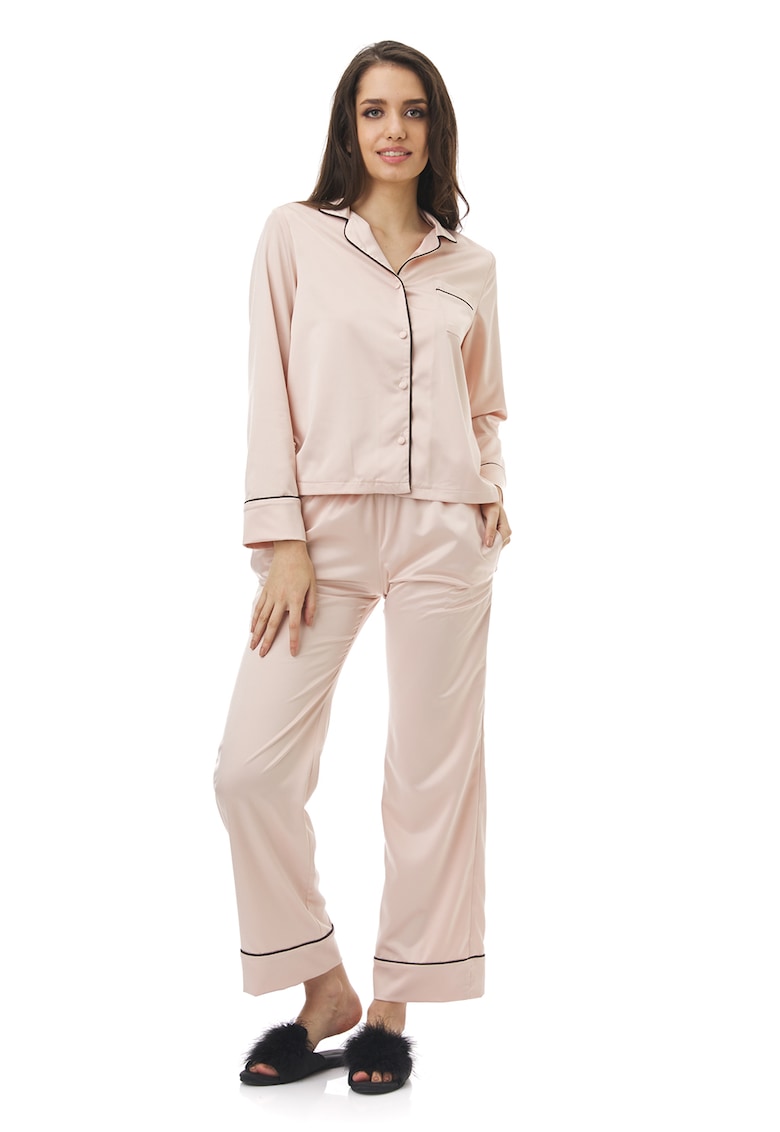 Характеристики Тип продукт: пижама Цвят: бледо розово Материал: полиестер – еластан Принт: без принт Яка: ревери с цепка Дължина ръкав: дълъг ръкав Талия: средновисока Дължина панталон: дълъг Джобове: 2 скосени – един на гърдите Детайли: контрастни зони – сатиниран ефект …
