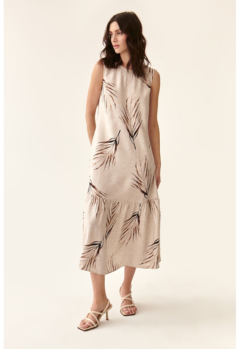 Характеристики Цвят: тъмнокафяв – бежов Стил: ежедневен Материал: лен – изкуствена коприна Принт: тропически Кройка: разкроена Дължина: средна Деколте: кръгло Дължина ръкав: без ръкав Закопчаване: цип Състав Външна част: 85% изкуствена коприна – 15% лен