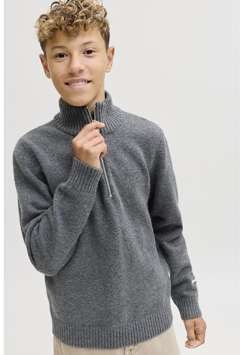 Характеристики Тип продукт: пуловер Цвят: меланж тъмно сиво Материал: полиестер – памук – акрил Кройка: стандартна Принт: без принт Деколте: около врата Дължина ръкав: дълъг ръкав Детайли: цепка с цип Закопчаване: без закопчаване Колекция: есен – зима Състав Външна част: …