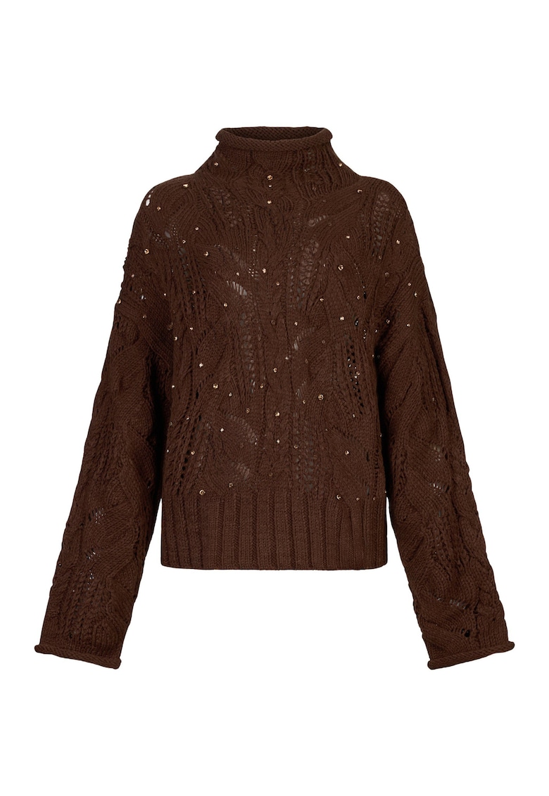 Характеристики Тип продукт: пуловер Цвят: кафяв Принт: без принт Материал: синтетичен – вълна – плетен Модел: поло Кройка: стандартна Закопчаване: без закопчаване Дължина ръкав: дълъг ръкав Детайли: декоративни камъни – плетка осморка – ажур Състав Външна част: акрил …