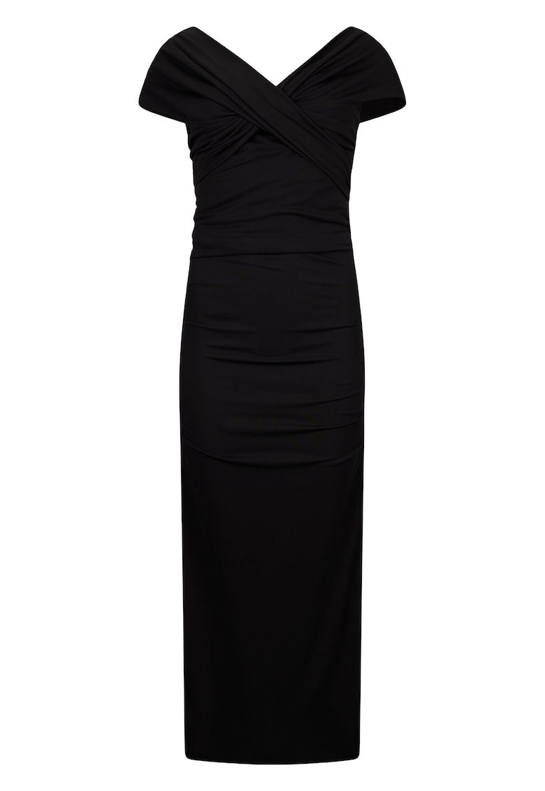 Характеристики Цвят: черен Стил: елегантен Материал: полиестер – еластан Принт: без принт Кройка: прилепнала Дължина: средна Деколте: шпиц – off-shoulders Дължина ръкав: къс ръкав Детайли: шпиц деколте отзад Състав Външна част: еластан – полиестер