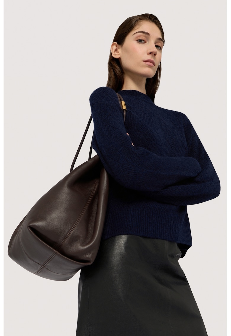 Характеристики Тип продукт: пуловер Цвят: тъмносин Принт: без принт Материал: коприна – вълна – вълна от алпака Модел: обло Закопчаване: без закопчаване Дължина ръкав: дълъг ръкав Състав Външна част: 35% вълна – 30% коприна – 24% вълна от алпака – 11% кашмир