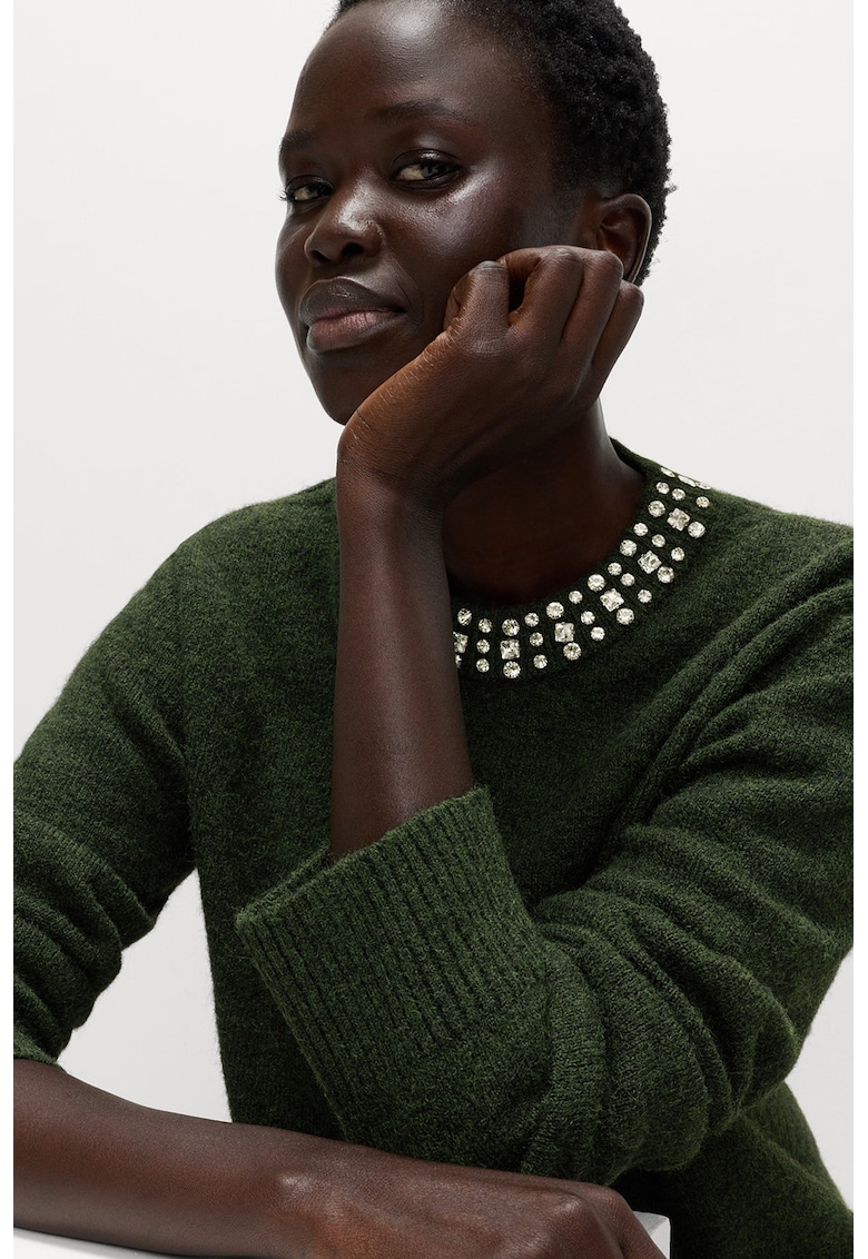 Пуловер с вълна с декоративни камъни – Бледо каки Marks Spencer