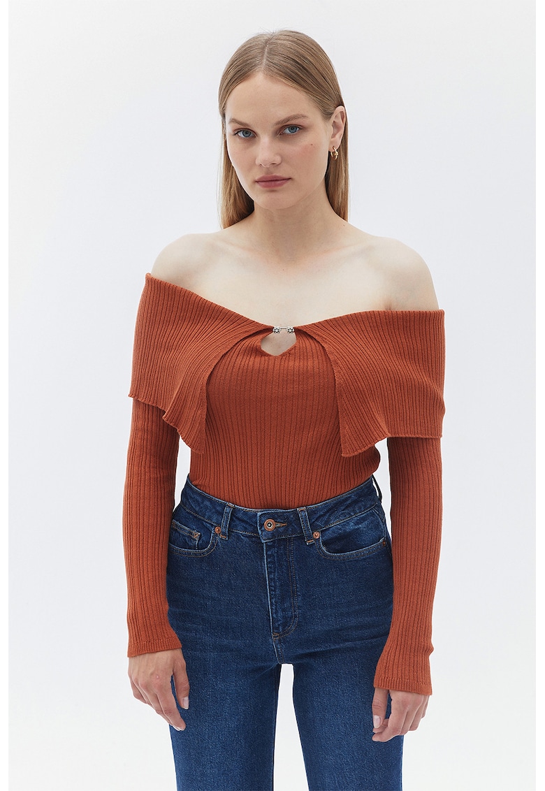 Характеристики Тип продукт: пуловер Цвят: изгорен портокал Принт: без принт Материал: вискоза – полиамид Кройка: голи рамене Дължина ръкав: дълъг ръкав Състав Външна част: 70% вискоза – 30% полиамид