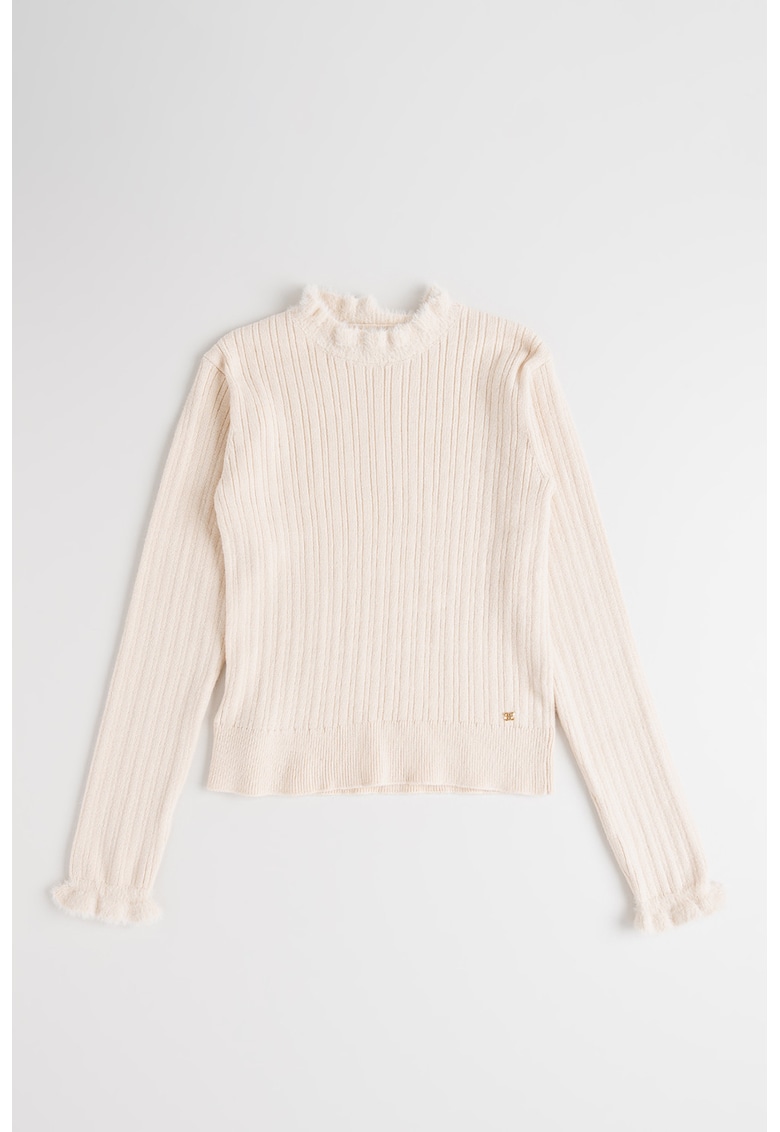 Характеристики Тип продукт: пуловер Цвят: бежов Материал: синтетични влакна – вискоза – плетен Кройка: стандартна Принт: без принт Деколте: обло Дължина ръкав: дълъг ръкав Детайли: релефна повърхност – еко пух Закопчаване: без закопчаване Състав Външна част: 46% вискоза …