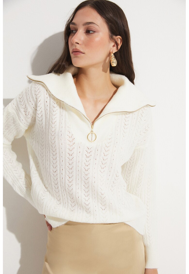 Относно Пуловер с паднали ръкави – ажур и къс цип June