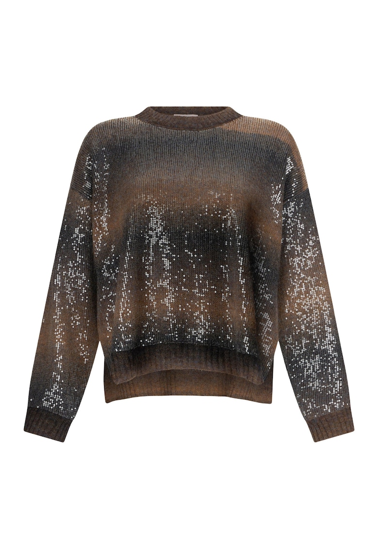 Характеристики Тип продукт: пуловер Цвят: сиво-кафяв Принт: райе – възлов батик Материал: синтетичен – вълна Модел: обло Кройка: свободна Закопчаване: без закопчаване Дължина ръкав: дълъг ръкав Детайли: странични цепки – апликации с пайети Състав Външна част: акрил …