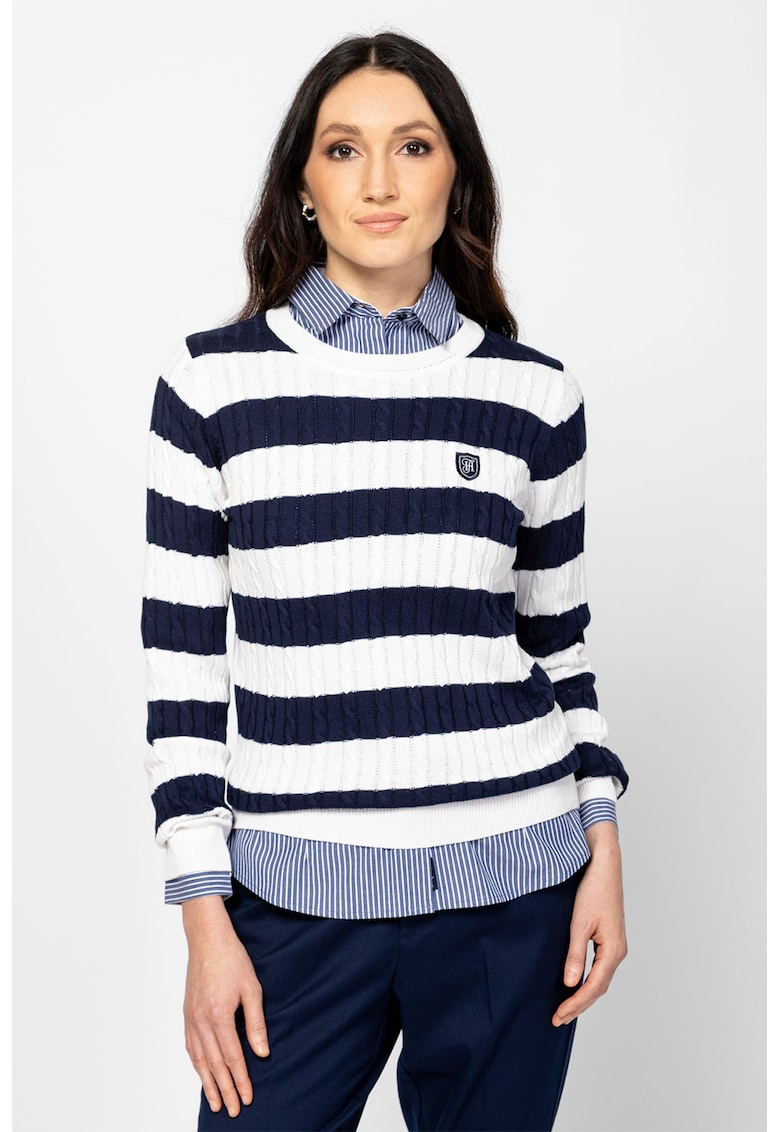 Характеристики Тип продукт: пуловер Цвят: ултрамарин синьо – бял Принт: райе Материал: памук – акрил Модел: обло Кройка: стандартна Закопчаване: без закопчаване Дължина ръкав: дълъг ръкав Детайли: плетка тип осморка Състав Външна част: 55% акрил – 45% памук