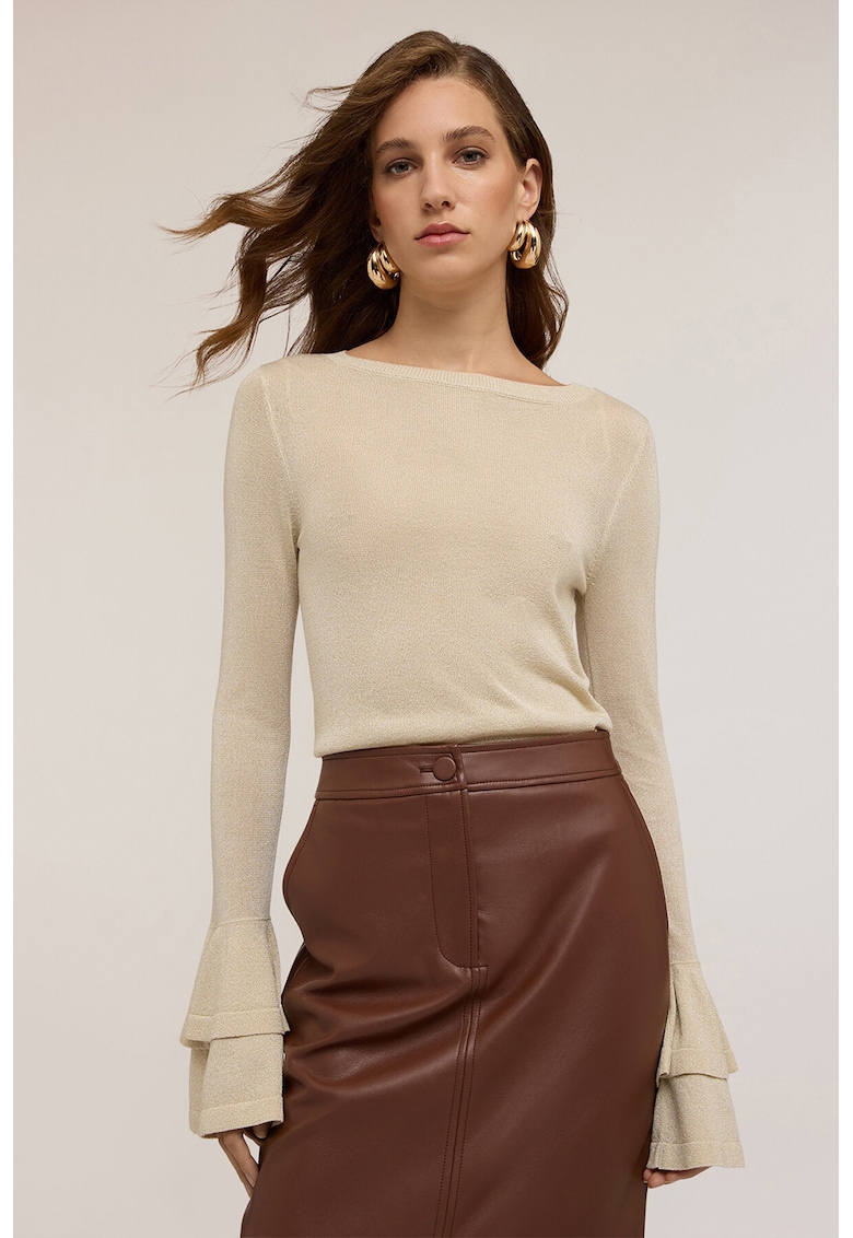 Характеристики Тип продукт: пуловер Цвят: светло бежово Принт: без принт Материал: вискоза Дължина ръкав: дълъг ръкав Детайли: разкроени маншети Състав Външна част: 77% вискоза – 15% полиестер – 8% метализирани нишки