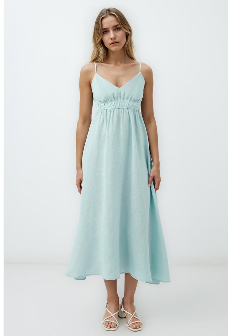 Характеристики Цвят: небесносин Стил: ежедневен Материал: лен Принт: без принт Кройка: разкроена Дължина: средна Деколте: шпиц Презрамки: регулируеми Дължина ръкав: без ръкав Състав Външна част: 100% лен