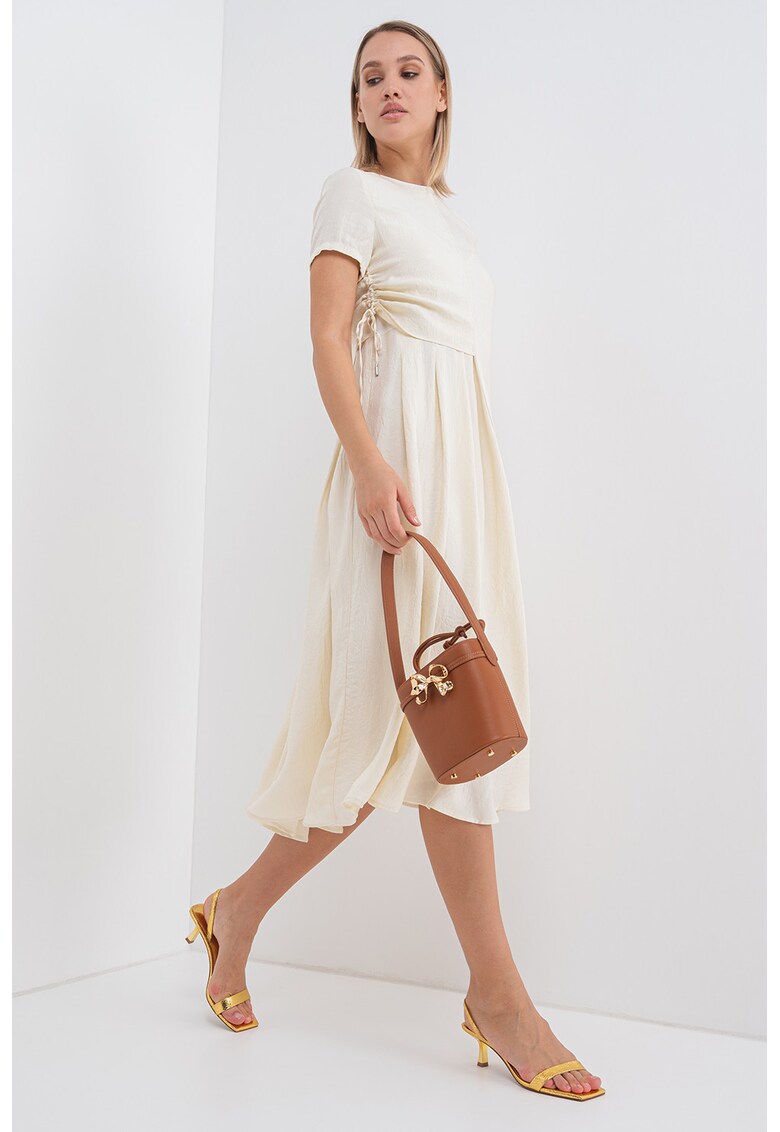 Характеристики Цвят: мръснобял Стил: ежедневен Материал: ацетат Принт: без принт Кройка: разкроена Дължина: средна Деколте: кръгло Дължина ръкав: къс ръкав Детайли: странични набирания Състав Външна част: 100% ацетат Подплата: 100% полиестер Информация за модел Моделът е …