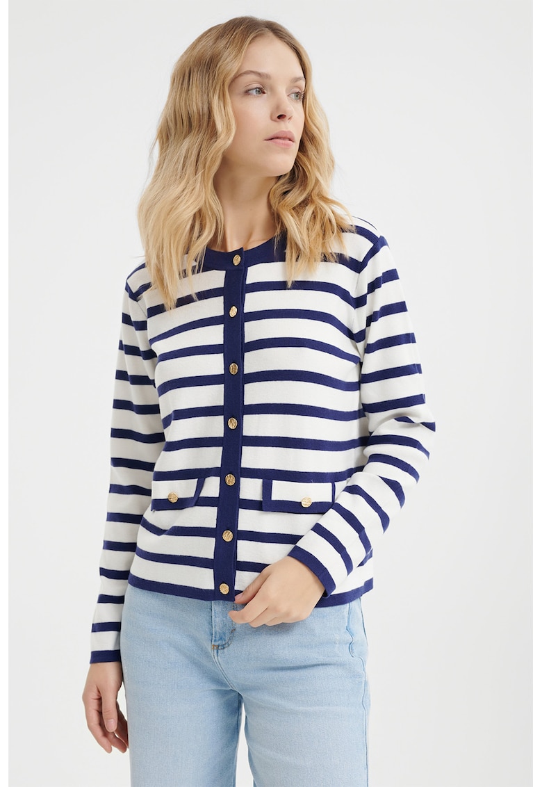 Характеристики Тип продукт: жилетка Цвят: мръснобял – тъмносин Принт: райе Материал: синтетичен – модал Модел: овален Кройка: стандартна Закопчаване: копчета Дължина ръкав: дълъг ръкав Състав Външна част: 30% акрил – 29% полиестер – 21% модал – 20% полиамид