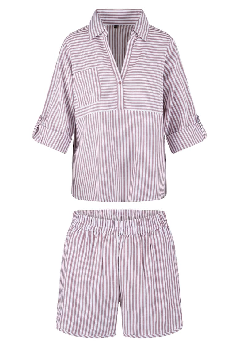 Характеристики Тип продукт: пижама Цвят: бял – лилав Материал: вискоза Принт: райе Яка: заострена Кройка: свободна Дължина ръкав: къс ръкав Талия: еластична Дължина панталон: къс Закопчаване: копчета Състав Външна част: вискоза