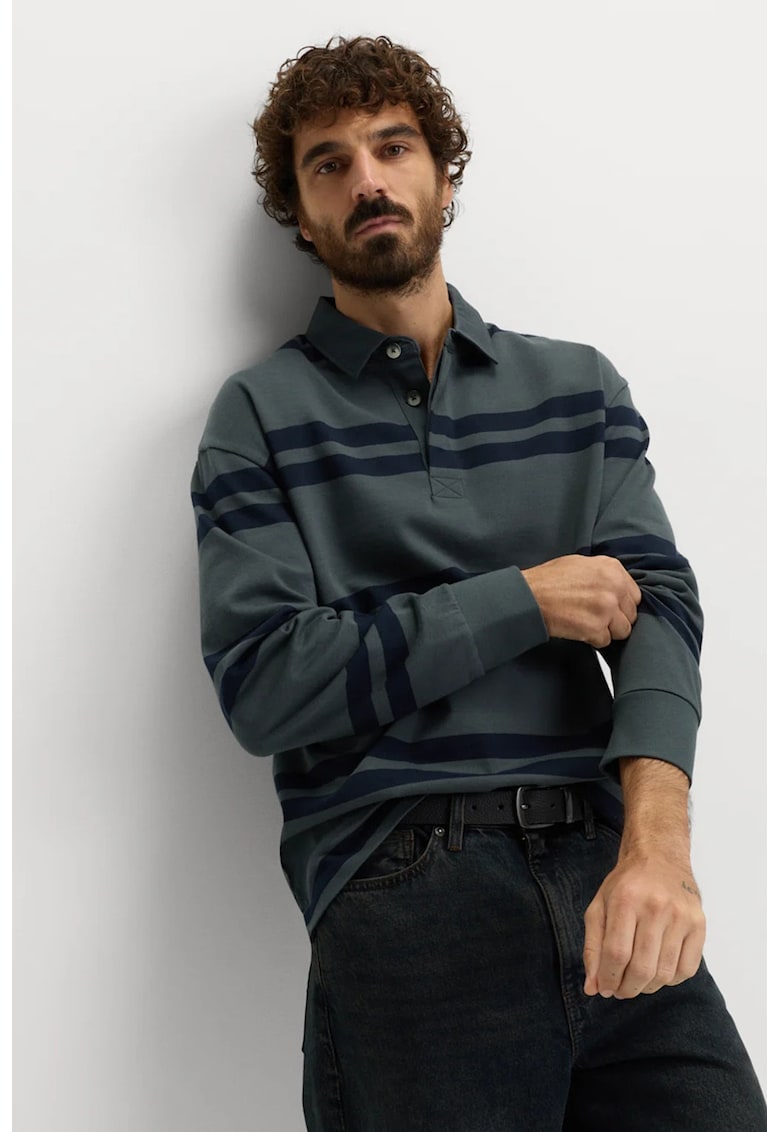 Характеристики Цвят: тъмносин – каки Принт: райе Материал: синтетичен – памук Стил: ежедневен Кройка: стандартна Закопчаване: копчета Яка: поло Дължина ръкав: дълъг ръкав Състав Външна част: 100% памук