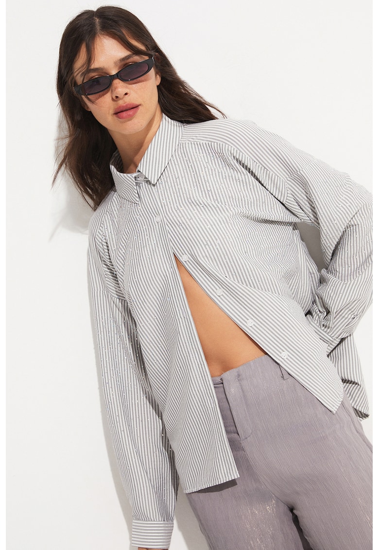 Характеристики Цвят: бял – tъмносив Принт: райе Стил: ежедневен Материал: полиестер Кройка: уголемена Яка: заострена Тип ръкав: свободнопадащ Дължина ръкав: дълъг ръкав Детайли: декоративни камъни Закопчаване: копчета Състав Външна част: 100% полиестер