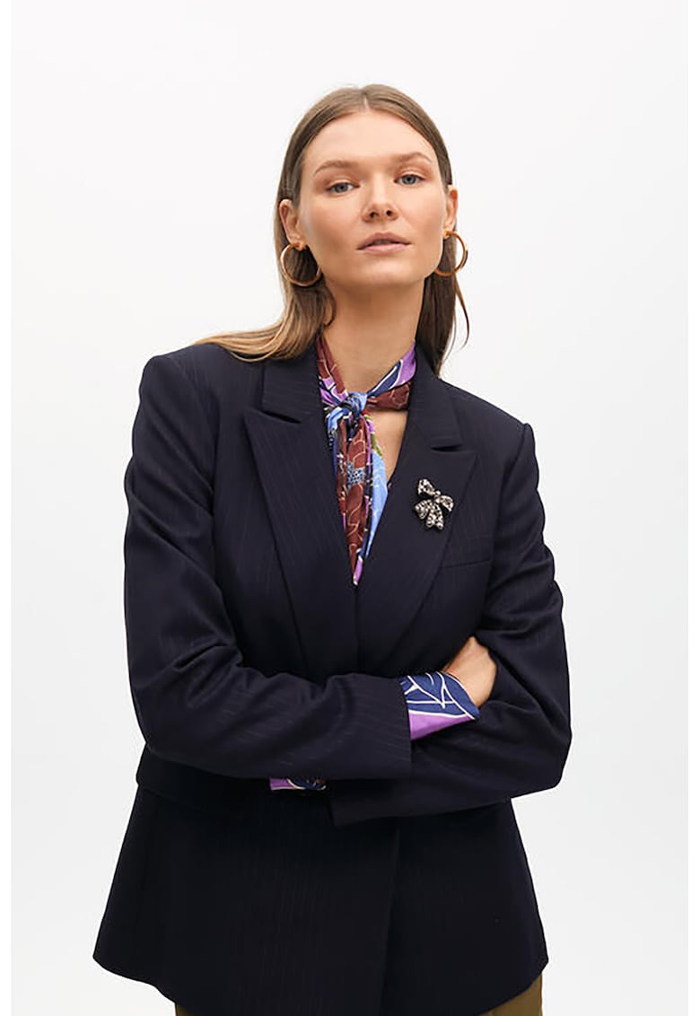 Характеристики Цвят: ултрамарин синьо Стил: елегантен Кройка: свободна Материал: синтетичен – вискоза Принт: райе Дължина ръкав: дълъг ръкав Закопчаване: копчета Състав Външна част: 62% рециклиран полиестер – 35% вискоза – 3% еластан Подплата: 100% полиестер