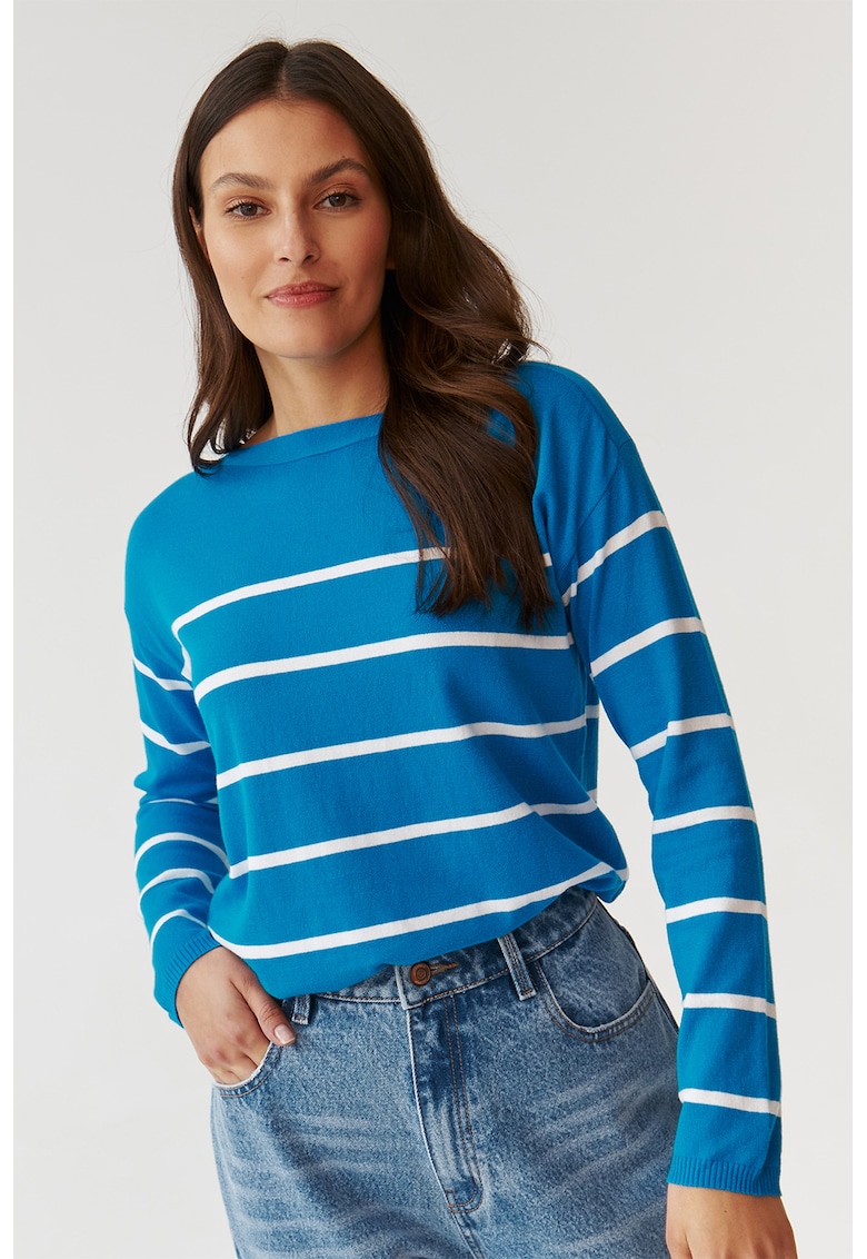 Раиран пуловер с деколте тип лодка – Бял/Син Tatuum