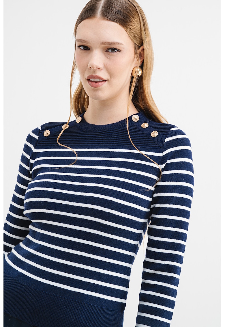 Раиран пуловер с декоративни копчета – Бял/Тъмносин GUESS