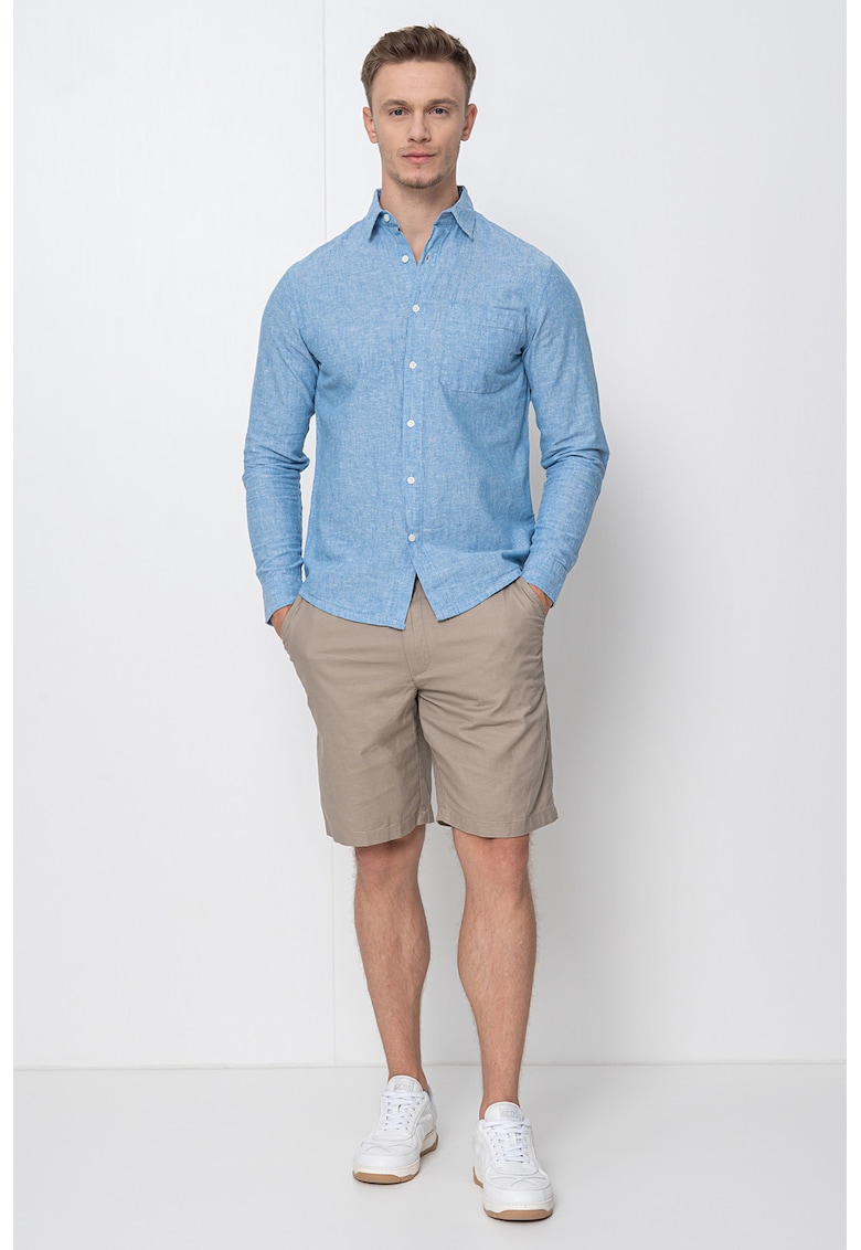 Характеристики Цвят: пастелносин Материал: памук – лен Принт: без принт Стил: ежедневен Кройка: стандартна Яка: заострена Дължина ръкав: дълъг ръкав Закопчаване: копчета Състав Външна част: 70% памук – 30% лен Информация за модел Моделът е облечен с размер M. Размер на …