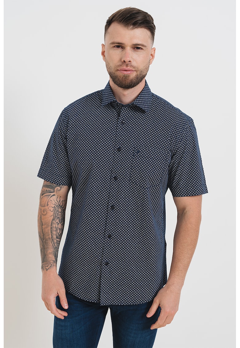 Характеристики Цвят: бял – тъмносин Материал: памук Принт: графичен Стил: ежедневен Кройка: стандартна Яка: класическа Дължина ръкав: къс ръкав Джобове: 1 на гърдите Закопчаване: копчета Състав Външна част: 100% памук Информация за модел Моделът е облечен с размер M. …