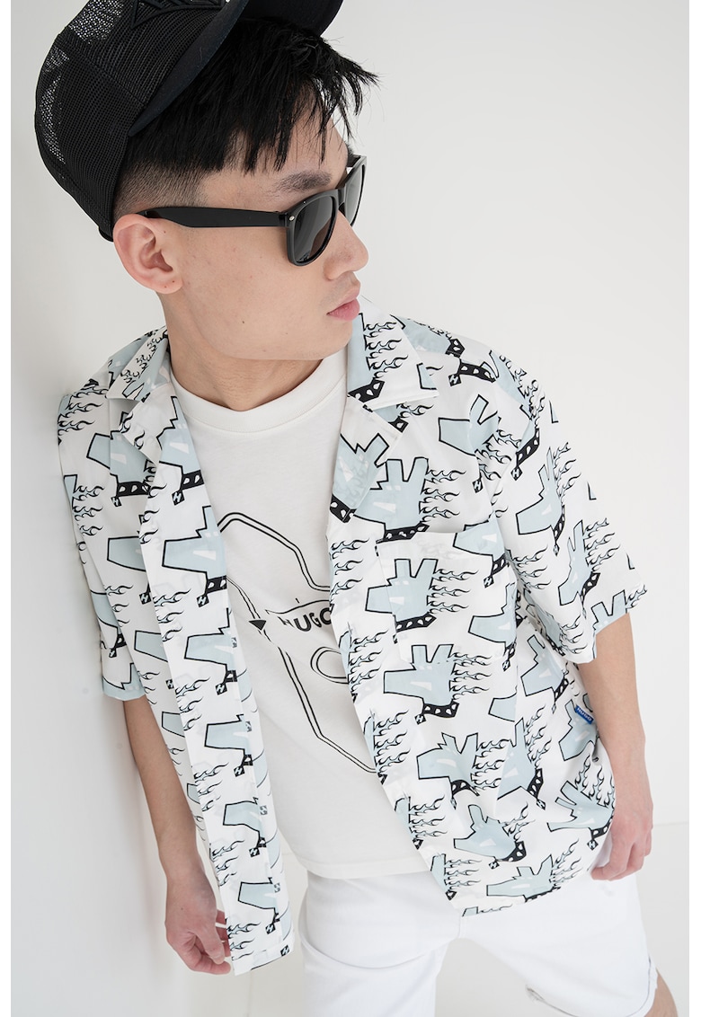Характеристики Цвят: бял – черен – аквамарин синьо Материал: памук Принт: графичен Стил: ежедневен Кройка: стандартна Яка: заострена Дължина ръкав: къс ръкав Джобове: 1 на гърдите Закопчаване: копчета Състав Външна част: 100% памук Информация за модел Моделът е облечен с …