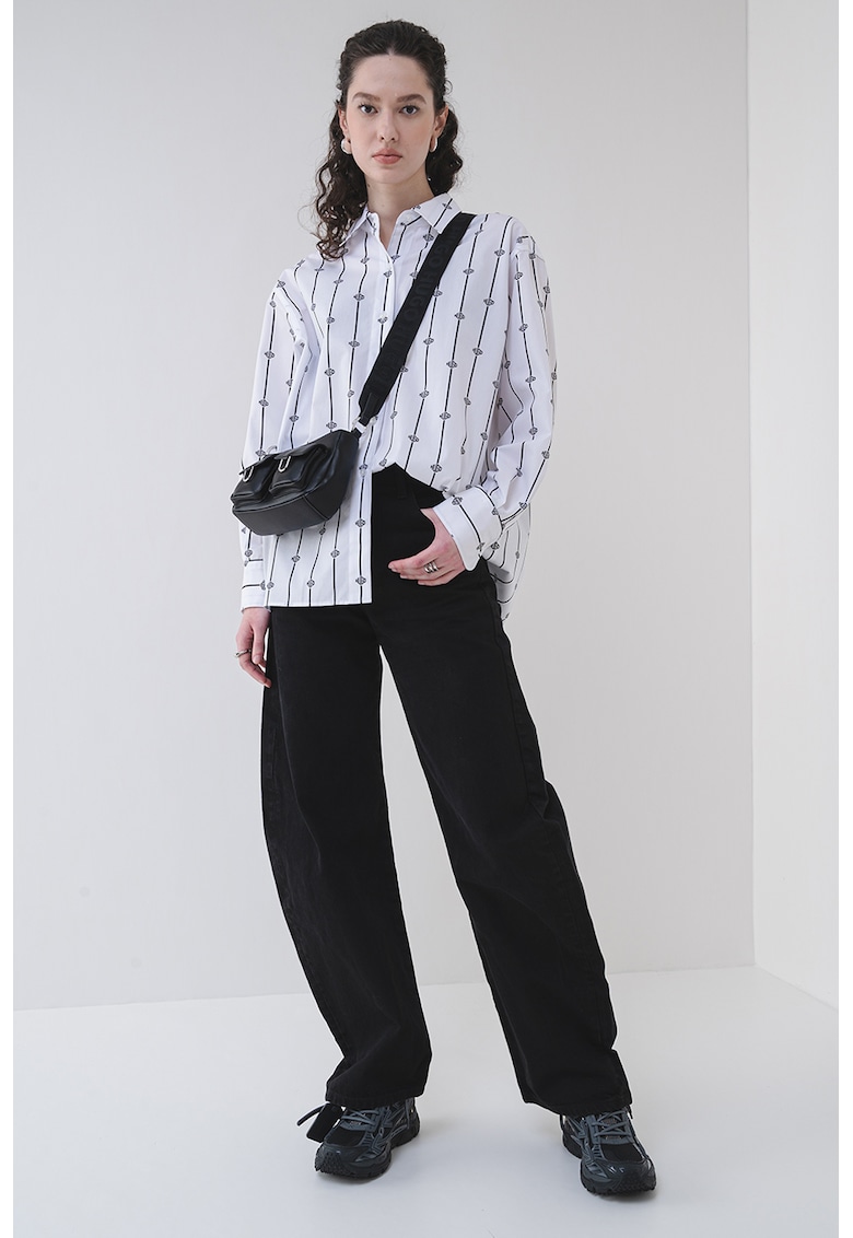 Характеристики Цвят: черен – бял Принт: райе – лого Стил: ежедневен Материал: памук Кройка: свободна Яка: класическа Дължина ръкав: дълъг ръкав Закопчаване: копчета Състав Външна част: 100% памук Информация за модел Моделът е облечен с размер S/36 EU. Размер на модела: 177 cm …