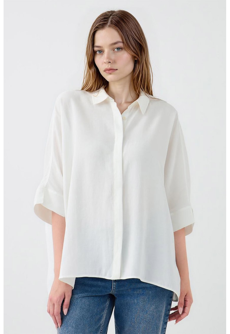 Характеристики Цвят: бял Принт: без принт Стил: ежедневен Материал: синтетичен – модал Кройка: свободна Яка: заострена Дължина ръкав: три четвърт Закопчаване: копчета Състав Външна част: 86% модал – 14% полиестер
